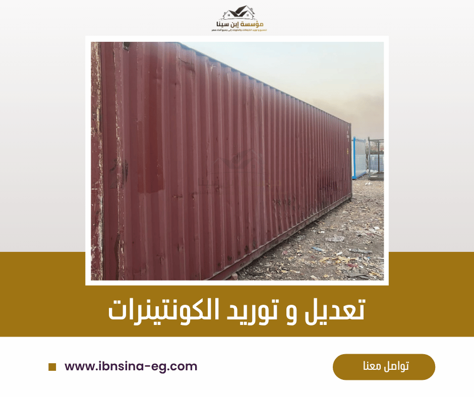 نقدم في “مؤسسة ابن سينا” خدمة رائدة في تعديل وبيع الكونتينرات (الحاويات) البحرية، وتحويلها من وحدات شحن إلى مساحات عملية ومتعددة الاستخدامات. نستخدم خبرتنا الهندسية لقص وتجهيز الكونتينرات لتصبح مكاتب إدارية متكاملة، نقاط بيع (أكشاك)، مطاعم متنقلة، أو وحدات سكنية مؤقتة. نضمن لك عملية تعديل احترافية تشمل العزل الكامل، إضافة الأبواب والشبابيك، التشطيبات الداخلية، والتوصيلات الكهربائية، لنقدم لك حلاً سريعاً، قليل التكلفة، وشديد المتانة.